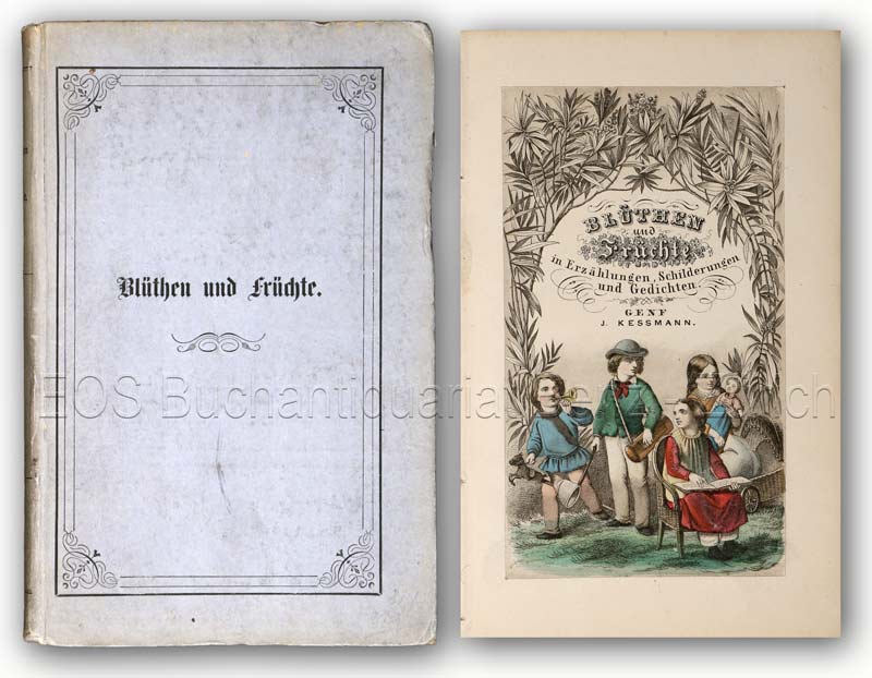 Adrien, E.G.; Blüthen und Früchte. 212 Erzählungen, Beschreibungen und Gedichte, gesammelt und herausgegeben von E.G. Adrien. – Fleurs et fruits choix de lectures allemandes destinées al l’enfance. 212 récits, contes, descriptions et poësies suivis d’un dictionnaire allemand-français. Genf u.a., J. Kressmann, 1858. 8°. 286 S. Mit 1 gest. Titel und 7 kol. Stahlstichtafeln. Orig.-Pappband.