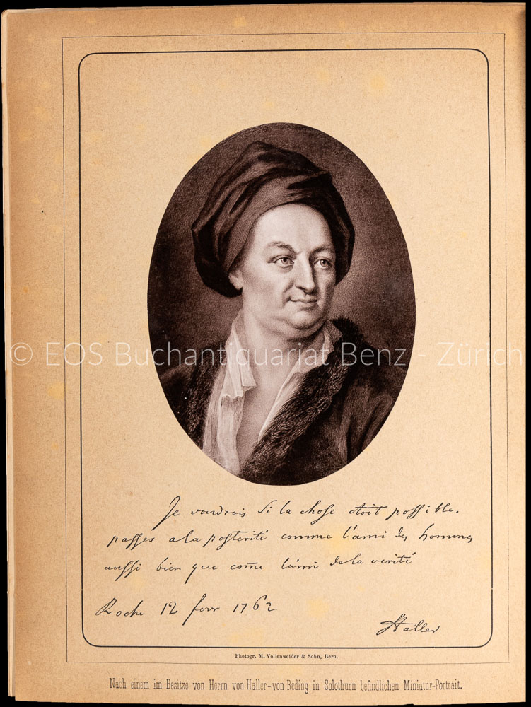 Albrecht von Haller. Geb., den 8. October 1708 – gest., den 12. December 1777. Denkschrift, herausgegeben von der damit beautragten Commission auf den 12. December 1877. Bern, Druck von B. F. Haller, 1877. 8°.