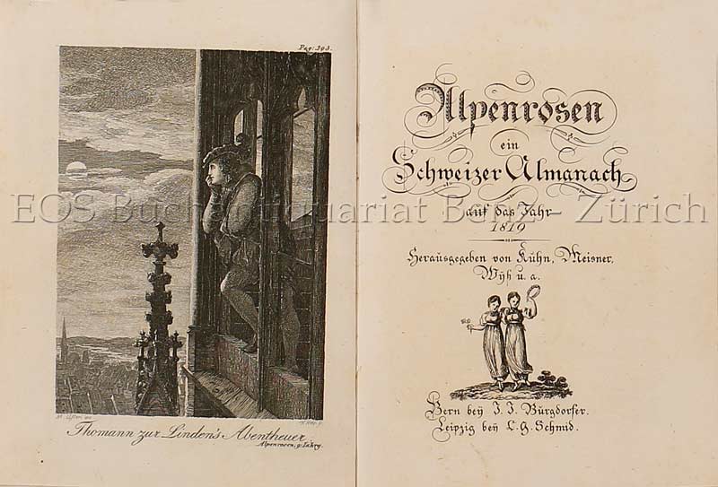 Alpenrosen. Ein Schweizer Almanach auf das Jahr 1819. Hrsg. von Kuhn, Meisner, Wyss et al. Bern u. Leipzig, Burgdorfer u. Schmid, 1819. 12°. 392 S. Mit 6 gest. Tafeln (davon 2 gef.) und 4 gef. Notenbl. Illustr. Orig.-Pappband in Schuber.