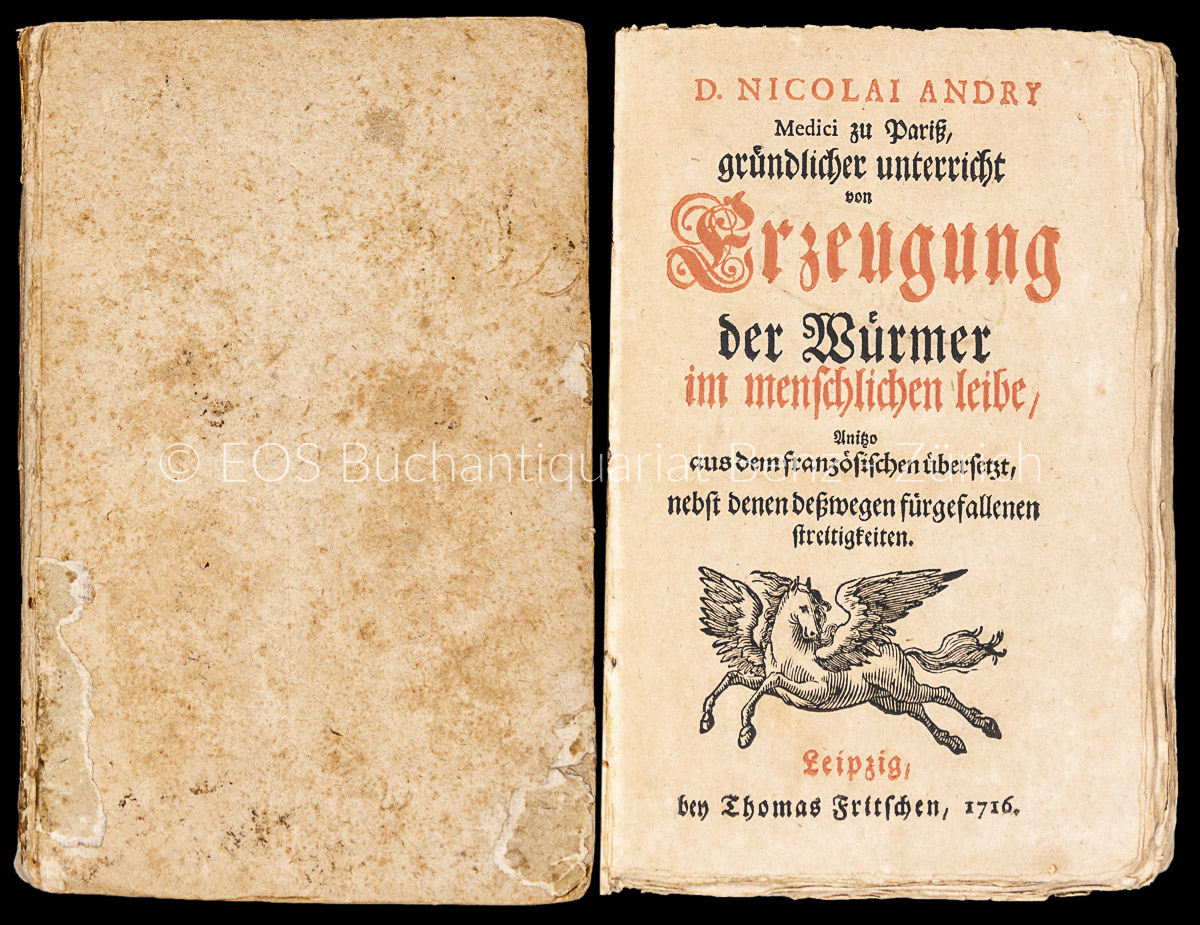 Andry (de Boisregard), Nicolas: Gründlicher Unterricht von Erzeugung der Würmer im menschlichen Leibe. Anjetzo aus dem Französischen übersetzt, nebst denen deswegen fürgefallenen Streitigkeiten. Leipzig, Thomas Fritsche, 1716. 8°. (12) Bl., 326 S.,1 Bl. Register. Mit 5 gestochenen Tafeln (davon eine gefaltet). Interims-Pappband aus der Zeit.