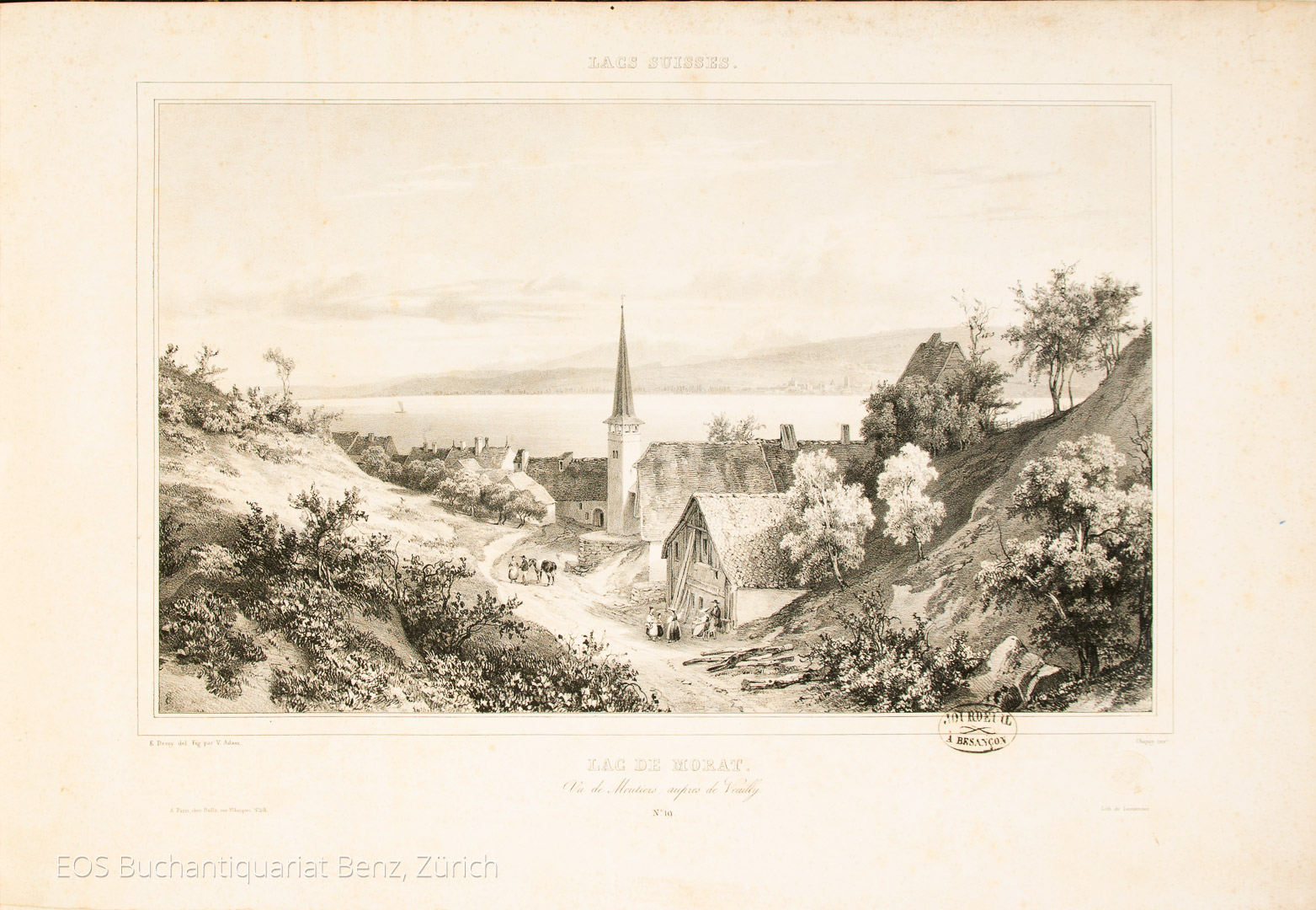 9 Schweizer Seen, 11 Ansichten der Schweiz, 4 Ansichten Ausland. Es sind dies: Lac de Morât, Lac de Sarnen, Lac de Lungern, Vue générale du Lac de Genève, Vue du Lac de Thun, Lausanne, Château Chillon, Lac de Lucerne, Lac de Vallenstatt, Vue de Tusis, Vue de Coire et du Mont Calanda, Basin de Misocco, Vue de Tusis, Château de Roezins, Une promenade sur le lac, Une noce à Brientz, Les artistes (Maison d’Unterseen), Pont et vallée de Ganther, Le Monte Rosa, Cascatelles de la Cenise, Le retour à la ferme, Le midi, Lac Lomond, Vue de Rio-Janeiro. – Einige Tafeln gestempelt: «Jourdeuil Besançon». – Mit Gebrauchsspuren. Einband berieben. Einige Tafeln montiert und stockfleckig. (Sprache: Französisch / Français / French)