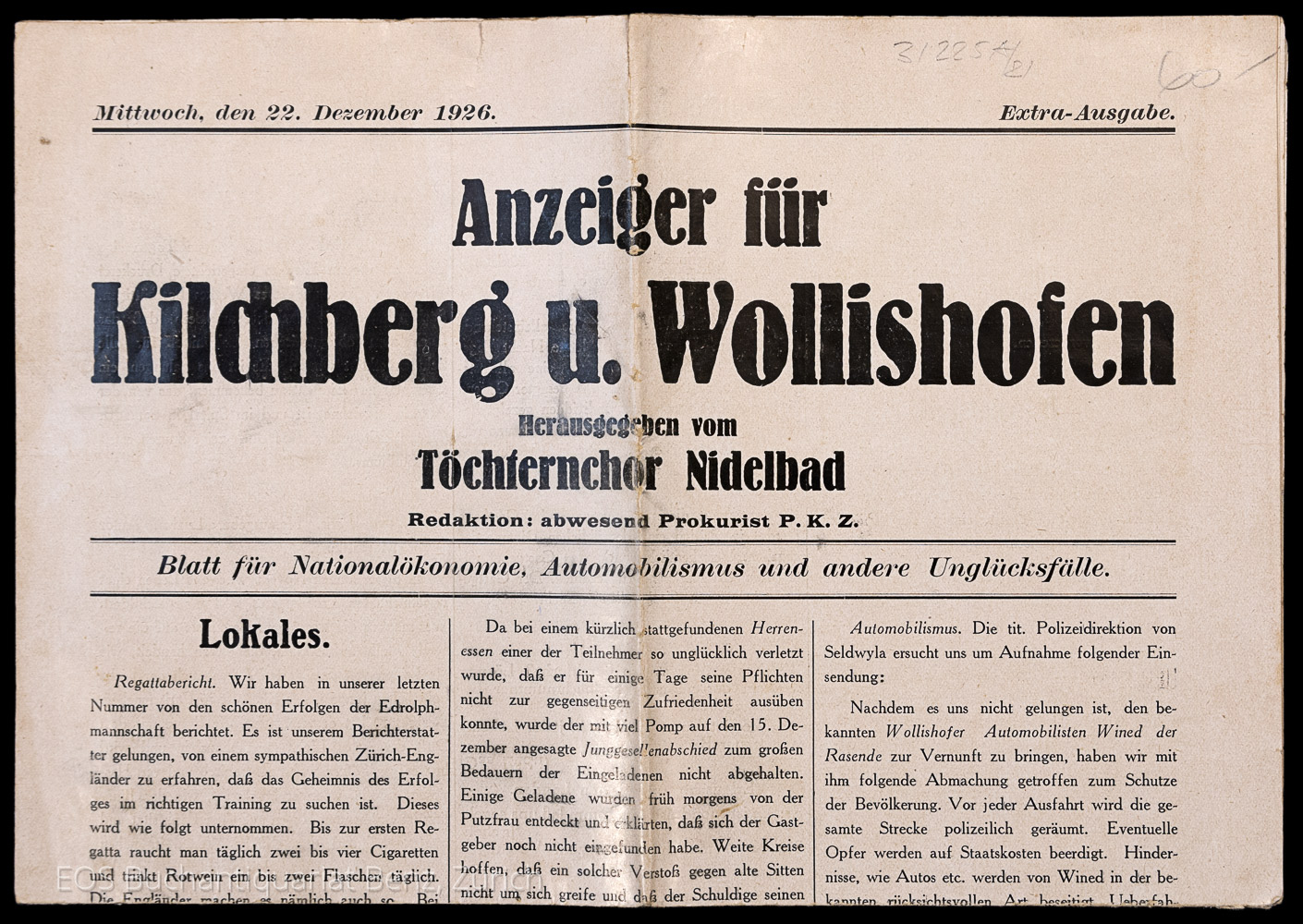 Anzeiger für Kilchberg u. Wollishofen. Herausgegeben vom Töchternchor Nidelbad. – Extraausgabe. 22. Dezember 1926. Folio. 4 S., gefaltet.