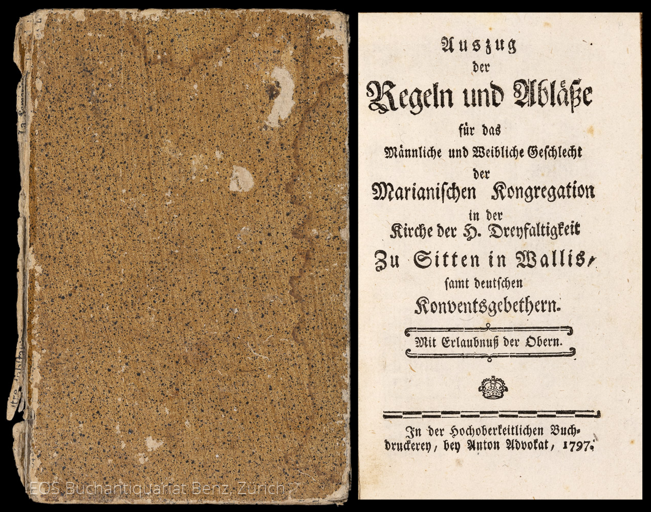 Auszug der Regeln und Ablässe für das Männliche und Weibliche Geschlecht der Marianischen Kongreation in der Kirche der H. Dreyfaltigkeit zu Sitten in Wallis, samt deutschen Konventsgebethern. In der Hochoberkeitlichen Buchdruckerey, bey Anton Advokat, 1797. 8°. 46 S. Pappband der Zeit.