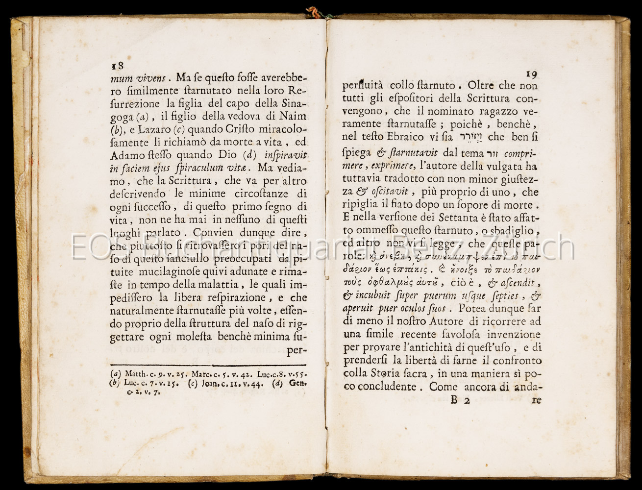 Abhandlung über das Niesen. Simone Ballarini (1716–1772), römischer Bibliothekar und Antiquar war im Dienste mehrerer Kardinäle (z.B. Monti und Barberini). Dieser kuriose Essay, der in einem populären und angenehmen Stil geschrieben ist, erklärt die Ursprünge des Brauchs, beim Niesen zu grüssen, und stützt sich dabei auf antike historische und literarische Quellen (z. B. Apuleius, Aristoteles, Cicero, Apuleius, Petronius, Plinius). – Der vordere fliegende Vorsatz fehlt. Das Papier durchgehend fleckig und angestaubt. Der Pergamentbezug, fleckig und mit alten Tuschzeichnungen. (Sprache: Italienisch / Italiano / Italian)