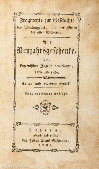 Balthasar, Joseph Anton Felix von: Fragmente zur Geschichte der Denkart und der Sitten der alten Schweizer. als Neujahrsgeschenke, der Luzernischen Jugend gewiedmet, 1779 und 1780. Erstes und zweytes (bis viertes) Stück. Luzern, Joseph Aloys Salzmann, 1781–1783. Neue vermehrte Auflage, 8°. 62 S., 104 S., 88 S., Halblederband der Zeit.