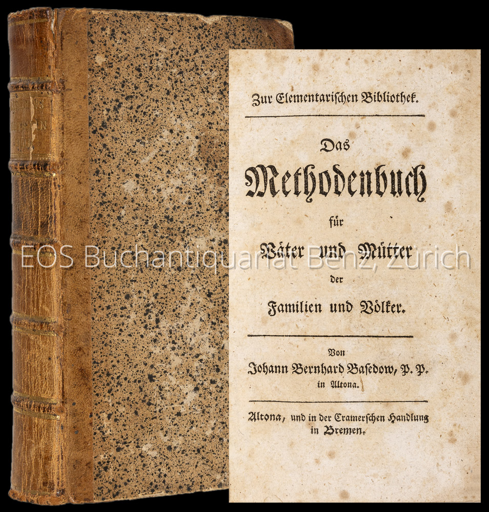 Basedow, Johann Bernhard:  Späteste Nachricht vom Elementarwerke, im April, 1770. Altona und Bremen, Cramer, 1770. 8°. (3) Bl., XII, (2), 560 S. Halblederband der Zeit mit verg. Rückentitel.