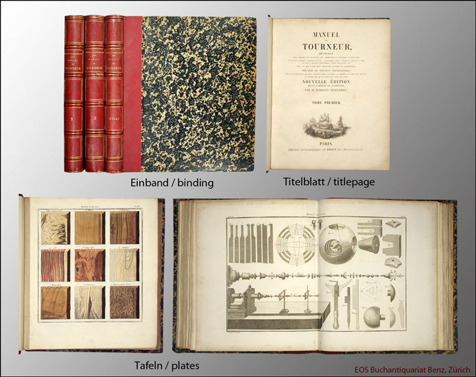 Bergeron, L.E., Hamelin-Bergeron, P. u. Salivet, Louis Georges Isaac: Manuel du Tourneur, Ouvrage dans lequel on enseigne aux amateurs la manière d’exécuter sur le tour pointes, a lunettes, en l’air, a guillocher, carré a portraits, a graver le verre et avec les machines excentriques, ovales, epicycloïde, etc. Tout ce que l’art peut produire d’utile et d’agréable; Précédé de notions élémentaires sur la connaissance des bois, la menuiserie, la forge, la trempe la fonte des métaux et autres arts qui se lient avec celui du tour: Paris, Roret, 1842. Nouvelle édition. 3 Bde. 4°. XXXII, 509(1) S.; XI(1), 542, 8 S. Mit 1 gest. Titel (Atlasband), 97 Kupfertafeln (dv. 8 kol., 41 doppelblattgross u. 10 gef.) Halblederbände der Zeit mit Rückenvergoldung (berieben und bestossen).