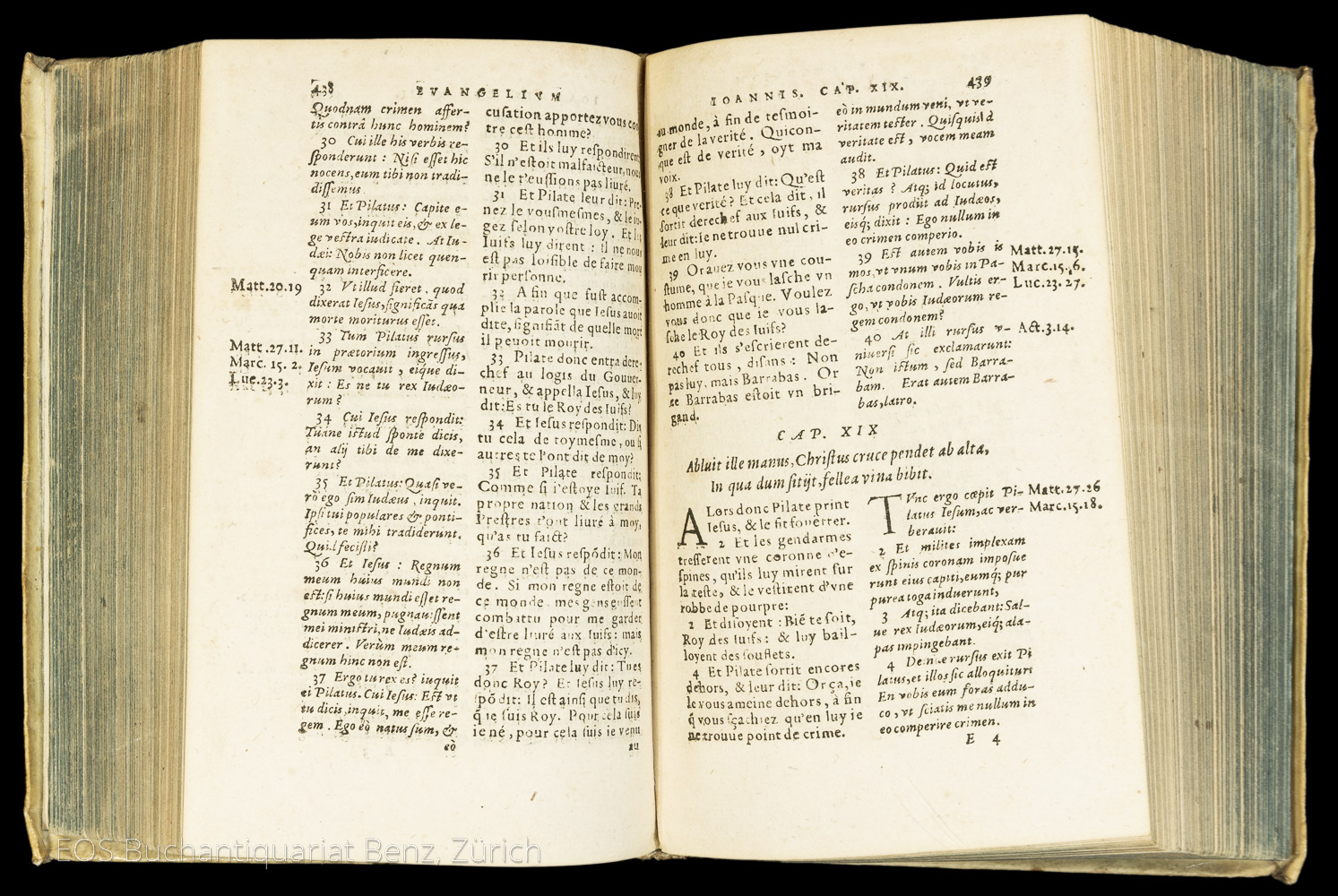 Biblia – Neues Testament. – Novum Jesu Christi Testamentum Latine & Gallice. Basel, Peter Perna, 1572. 8°. (4) Bl., 1020 (recte 1008) S. Bogennorm: )(4, a8–z8, A8–Z8, Aa8–Rr8. Pergamentband der Zeit mit handschr. Rückentitel.