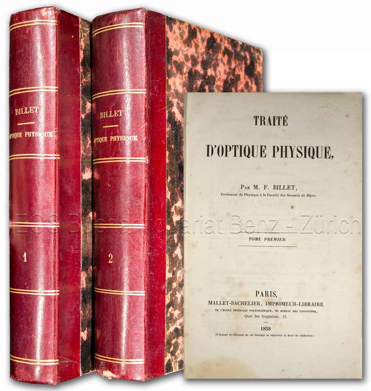 Billet, F(élix): Traité d’optique physique. Paris, Mallet-Bachelier, 1858–1859. 2 Bände. 8°. XVI, 539 S.; VIII, XVI, 640 S. Mit 14 gef. Tafeln. Halblederbände der Zeit.