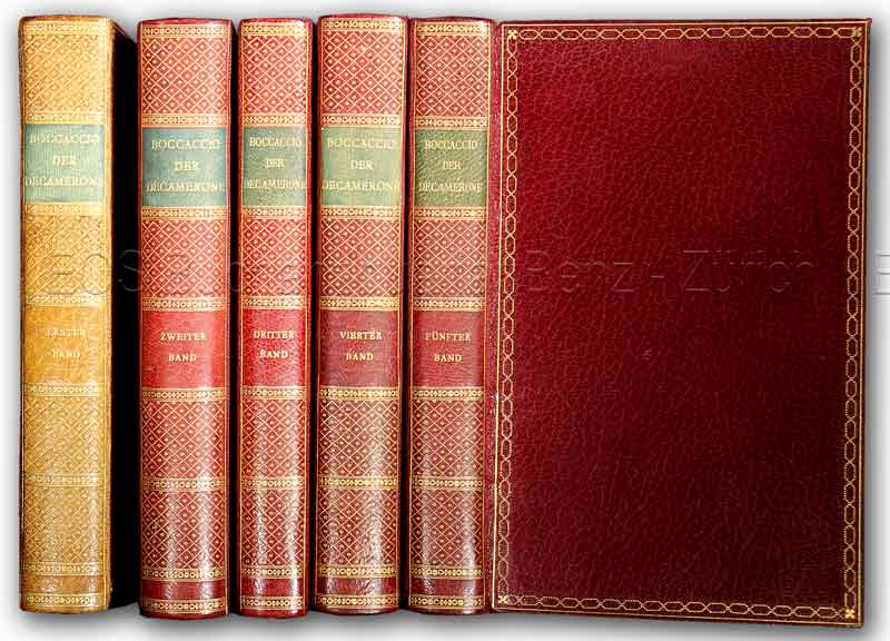Nicht bei Rodenberg. – Faksimile der berühmten Boccaccio-Ausgabe. “Von dieser Ausgabe wurden 100 Exemplare für die Mitglieder der Vereinigung ‘Die Hundert’ auf Velin von Van Gelder mit dem Hundertzeichen, weitere 100 Exemplare auf gleichem Velin mit dem Wasserzeichen “Boccaccio” für die Luxusausgabe abegezogen.” Vorliegendes Exemplar ist Nr. 42 der Luxusausgabe. – Rücken von Bd. 1 und Teil des hinteren Deckel etwas verblasst, Kratzer auf Vorderedeckel von Bd. 4.