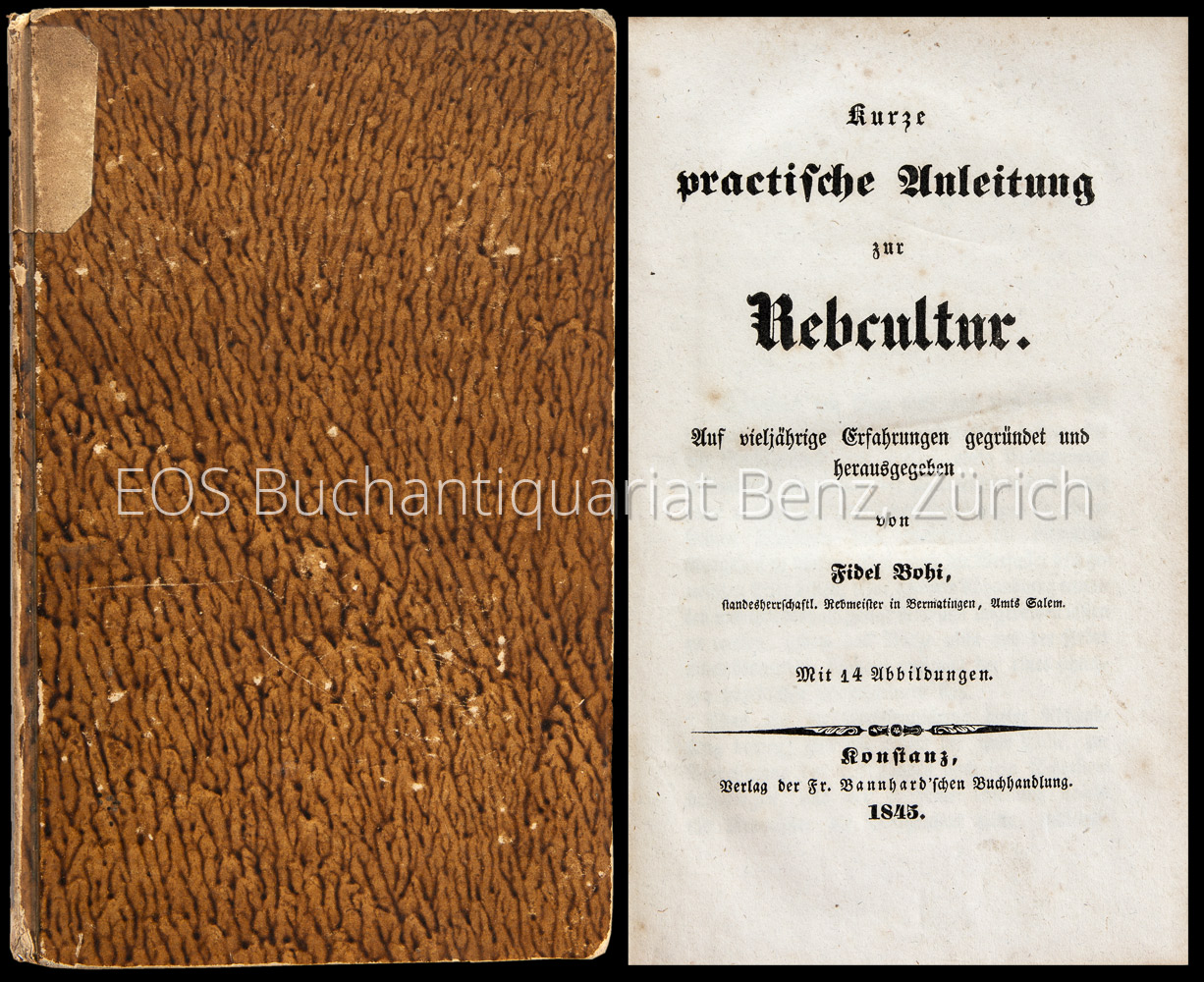 Bohi, Fidel: Kurze practische Anleitung zur Rebcultur. Auf vieljährige Erfahrungen gegründet … Konstanz, Fr. Bannhard’sche Buchhandlung, 1845. XII, 137 Seiten. Mit 8 Tafeln (davon eine mehrfach gefaltet). Pappband der Zeit mit Kleisterpapierbezug.