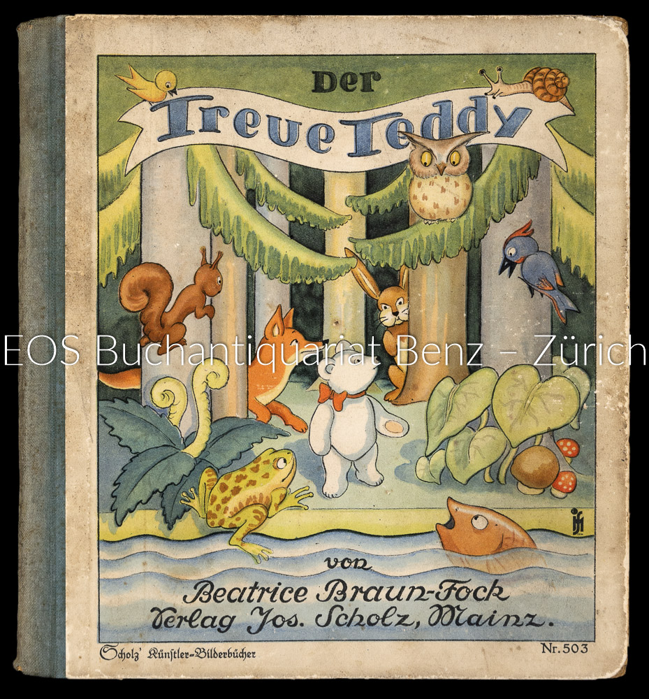 Braun-Fock, Beatrice: Der treue Teddy. Mainz, Scholz, (1934). 8°. 13 Bl. Mit 12 farb. Illustrationen von Beatrice Braun-Fock. Farb. illustr. Orig.-Halbleinenband.