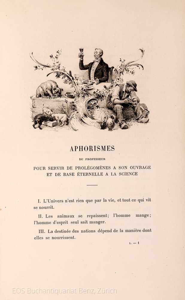 Brillat-Savarin, Jean Anthelme: Physiologie du gout. Nouvelle édition illustrée. Paris, L. Carteret, 1923. 2 Bände. 4°. 279 S.; 258 S. Mit 1 Porträt, 64 Radierungen von Léon Boisson und Louis Monzies nach Zeichnungen von Henri Pille und Maurice Leloir. Illustrierte Orig.-Broschuren mit Pergamin-Schutzumschlag.