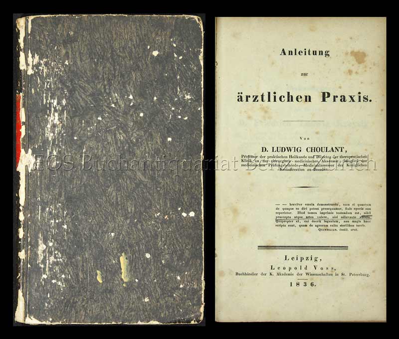 Hirsch II, 18 (für den Verfasser). – Johann Ludwig Choulant (1791-1861) war nach seinem Medizinstudium in Leipzig ab 1821 in Dresden tätig, wo er 1828 zum Professor und später zum Direktor der medicinisch-chirurgischen Akadmie ernannt wurde. “Choulant war ein äusserst scharfsinniger, kenntnisreicher und fleissiger Arzt, dessen hauptsächliche Bedeutung in seinen hervorragenden Leistungen auf dem Gebiete der Geschichte der Medicin im weitesten Umfange zu suchen ist” (Hirsch). – Papier leicht stockfleckig und gebräunt. Einband berieben und bestossen.