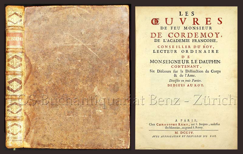Cordemoy, (Gérau de):  Les Oeuvres du feu Monsieur Cordemoy … contenant, Six Discours sur la Distinction du Corps & de l’Ame. Divisées en trois Parties. Paris, Christophe Remy, 1704. 4°. Titel in Rot und Schwarz. (9) Bl., 134 S., (9) Bl., 247, (3) S. Mit 1 gest. Titelvignette und Holzschnitt-Buchschmuck. Kalbleder d. Zt. mit reicher Rückenvergoldung und Rückenschild.