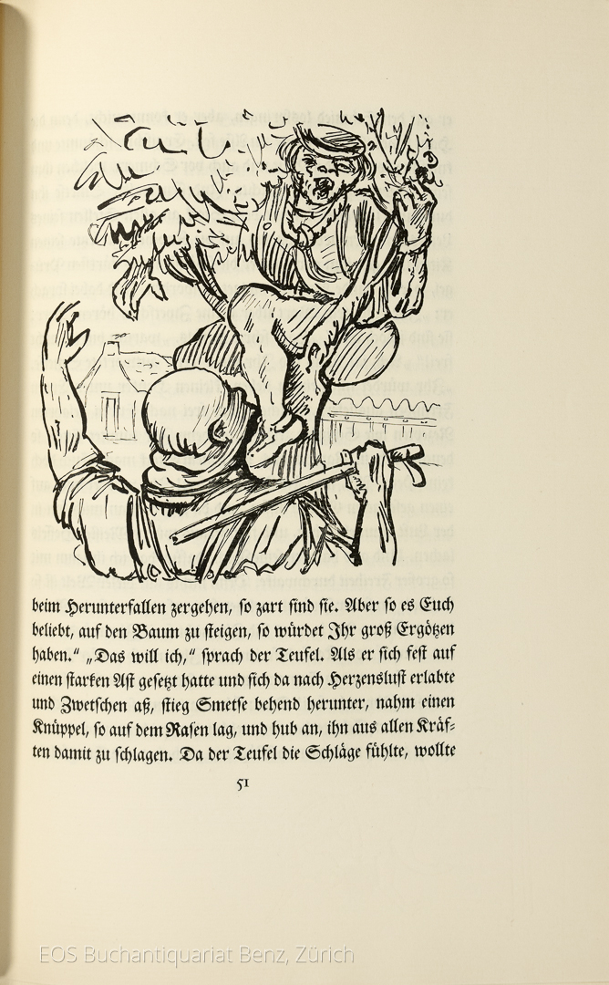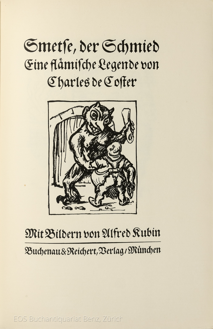Coster, Charles de:  Smetse, der Schmied. Eine flämische Legende. München, Buchenau & Reichert, (1923). (2), 103, (3) S. Mit Titelvignette, zweifarbiger Initiale und 24 Illustrationen, in Holz geschnitten von Albert Fallscheer nach Ferderzeichenungen von Alfred Kubin Orig.-Halbpergament. Mit Pappschuber.