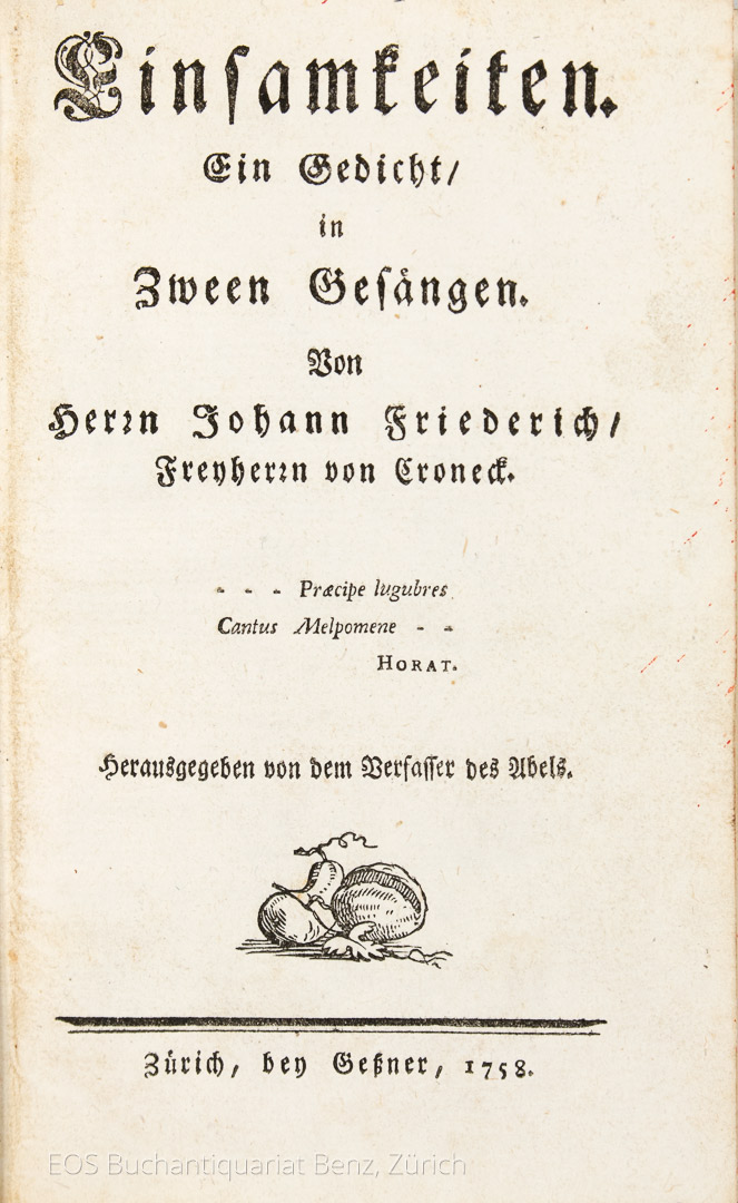 Croneck, Johann Friedrich von: Einsamkeiten. Ein Gedicht in zween Gesängen. Zürich, Gessner, 1758. 8°. 46 S. Lederband der Zeit mit verblasster Rückenvergoldung.
