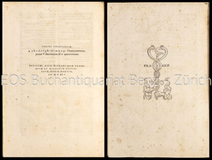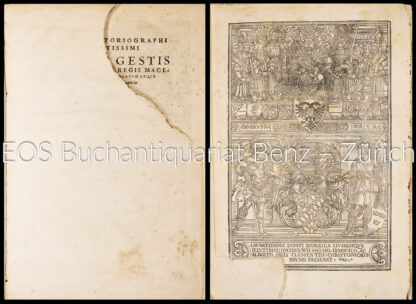 Curtius Rufus, Quintus: De rebus gestis Alexandri Magni Macedonum Regis Macedonum opus, ita demum emendatum atque… Accesserunt enim antehac nunquam uisa, duorum in principio liborum… Basel, Froben, 1545. 4°. (3) Bl., 171 S., (6) Bl. (Register und Druckermarke). Mit ganzs. Frontispiz und Wappenholzschnitt. Pergamentband der Zeit mit handschrftlichem Rückentitel.
