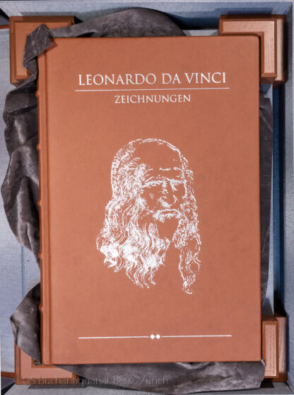 Da Vinci, Leonardo: Die Zeichnungen und Miscellaia von Leonardo da Vinci in der Sammlung ihre Majestät der Königin in Schloss Windsor. Anatomische Studien. Stuttgart, Belser Verlag, 2017. 1 Band und 1 Mappe. 2° (57 x 43 cm). 247 S., 83 Blatt mit Illustrationen. Illustrierter Lederband, Leinenmappe in Halblederkassette. “The Queen’s Collection – Windsor Castel”