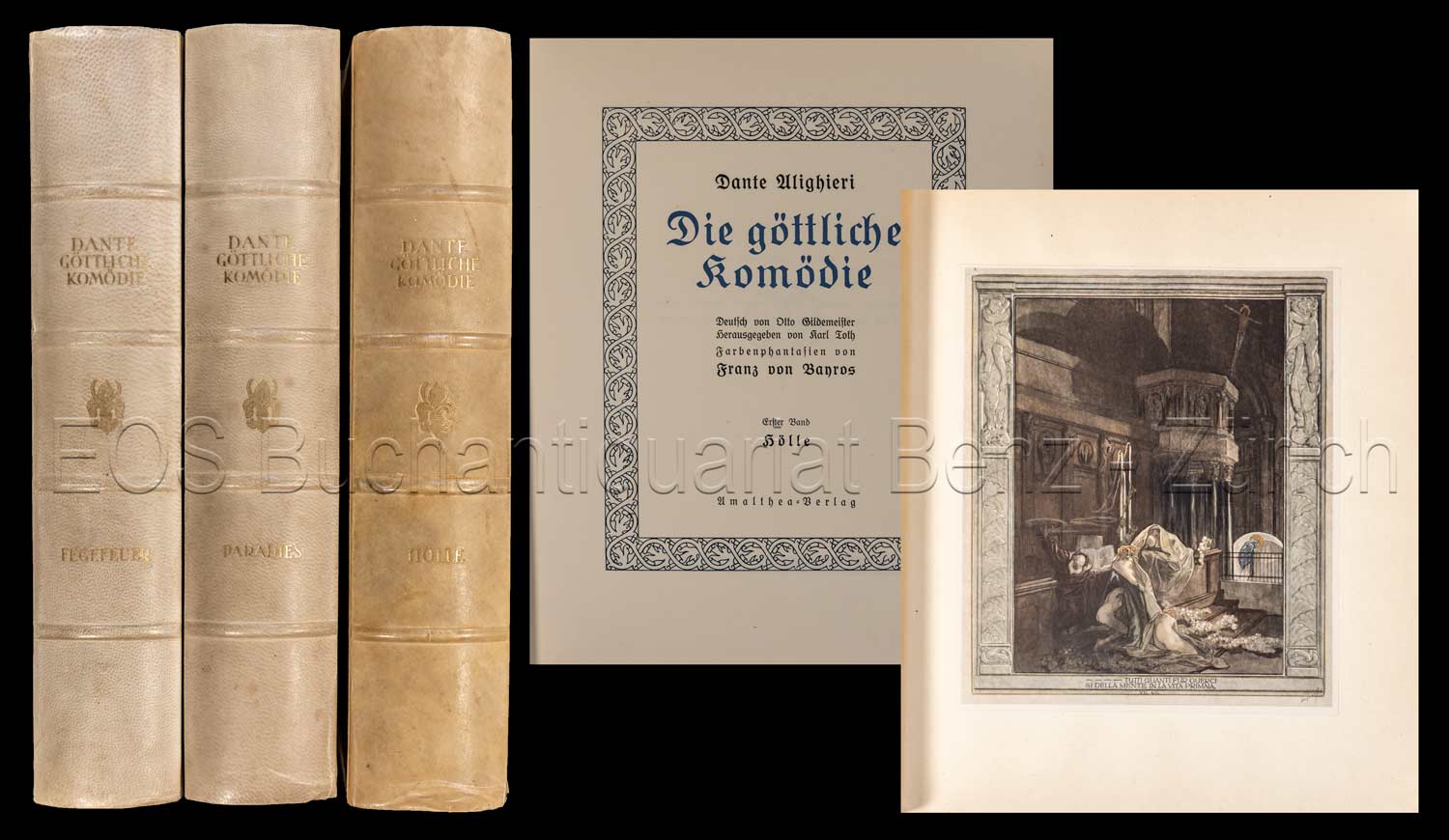 Dante, Alighieri: La Divina Commedia – Die göttliche Komödie. Zürich, Leipzig, Wien, Amalthea-Verlag, 1921. 4°. (4) Bl., XLIV, 428 S., (1) Bl.; (4) Bl., 434 S.; (3) Bl., 443 S. Mit 60 farbigen Tafeln von Franz von Bayros. Goldgeprägter Orig.-Halbpergament mit Kopfgoldschnitt.