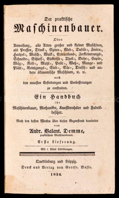 Demme, Andr(eas) Valent(in):  Der praktische Maschinenbauer. Oder Anweisung, alle Arten grosser und kleiner Maschinen, als Pressen, Druck-, Spinn-, Web- (etc.) und andere ökonomische Maschinen … nach den neuesten Erfindungen und Verbesserungen zu construieren. Ein Handbuch für Maschinenbauer, Mechaniker, Kunstdrechsler und Fabrikbesitzer. Nach den besten Werken über diesen Gegenstand bearbeitet. Quedlinburg und Leipzig, Gottfr. Basse, 1834. 1 Textband (1. Lieferung) und Tafelbände 1-22. 8° und Quer-Folio. Textband: VIII, 376 S.; Tafelbände total 636 num. gest. Tafeln. Textband HLdr. d. Zt., Tafelbände Pappbd. mit handgeschr. Etiketten (Bd. 3 und 4 mit den Original Druck-Etiketten).