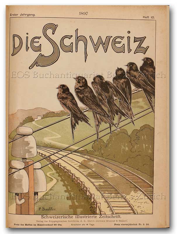 Die Schweiz. Schweizerische illustrierte Zeitschrift. Erster Jahrgang. Zweiter Jahrgang. Zürich, Polygraphisches Institut, 1897-98. 26 Hefte (1897, 1897/98) u. 22 Hefte (1898) in 2 Bänden. 4°. 557 S., 110 S. (Anzeigen); 520 S., 88 S. (Anzeigen). Mit 48 (dv. 27 chromolithogr.) Deckelillustr., zahlr. (dv. mehrere farb.) Tafeln u. Textillust. u. -abb. Moderne Leinenbände.