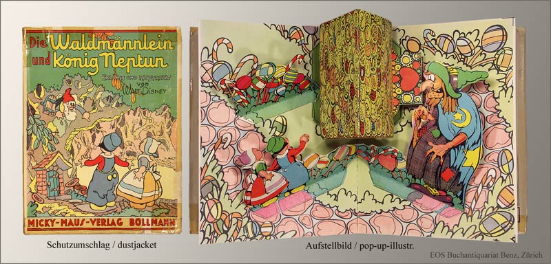 Pop-up-Bilderbuch.- Disney, Walt:  Die Waldmännlein und König Neptun. Zürich, Micky-Maus-Verlag Bollmann, (1936). Gr.-8°. 43 S. Mit zahlr. z.T. ganzs. Abb. und 4 doppels. farb. Aufstellbildern von Walt Disney. Farbig illustr. Orig.-Pappband mit Schutzumschlag in Pappschuber = “Micky-Maus-Wunderbücher”.