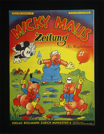 Zeitschrift Nr. 17 dieser frühen deutschen “Micky Maus Publikation”, übersetzt aus dem Englischen von Martha Ehrat-Bollmann. Der Zürcher Verlag Bollmann erwarb 1936, wohl um über die allgemeine Wirtschaftskrise hiwegzukommen gleichzeitig in Paris beim europäischen Vertreter des Disney-Verlages die Hauptlizenz und in Italien bei Mondadori, der damals die Comics unter dem Namen “Topolino” in italienischer Sprache veröffentlichte, die Unterlizenzen, diese viel zu teuer trugen zum Misserfolg der Reihe “Micky-Maus-Wunderbücher” bei. Der Preis der Bände bis zu sieben Schweizer Franken war während der allgemeinen Krise viel zu hoch und die finanzielle Situation konnte auch mit der halbmonatlichen Herausgabe der vorliegenden Zeitschrift, die zwischen 25 und 30 Rappen zu haben war, nicht verbessert werden. Die Produktion wurde nach dem 18. Heft und dem 7. Buch eingestellt, nachdem der Verlag erfolglos in Deutschland und Österreich nach Partnern gesucht hatte. Im Nazideutschland war die Publikation dieses amerikanischen Imports unerwünscht, obwohl Joseph Goebbels dem Führer 1937 18 Micky-Maus-Filme zu Weihnachten geschenkt haben soll und “sie insgeheim Spass an den Zeichentrickfilmen von Walt Disney hatten” (Laqua, Carsten: Wie Micky unter die Nazis fiel. Rowohlt, 1992). – Gefaltetes Exemplar mit kleinen hinterlegten Einrissen. Sonst gut erhalten. Résumé: Early Micky Mouse in German printed in Switzerland. – Folded copy, otherwise in a good condition.