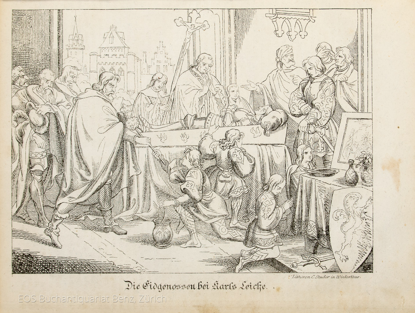 Disteli, Martin: Schweizerischer Bilderkalender für das Jahr (1839–1845). Solothurn, Gassmann, Kl. 4°. 7 illustr. Titelbl. und zahlreichen Textillustrationen von Martin Disteli. Halblederband.