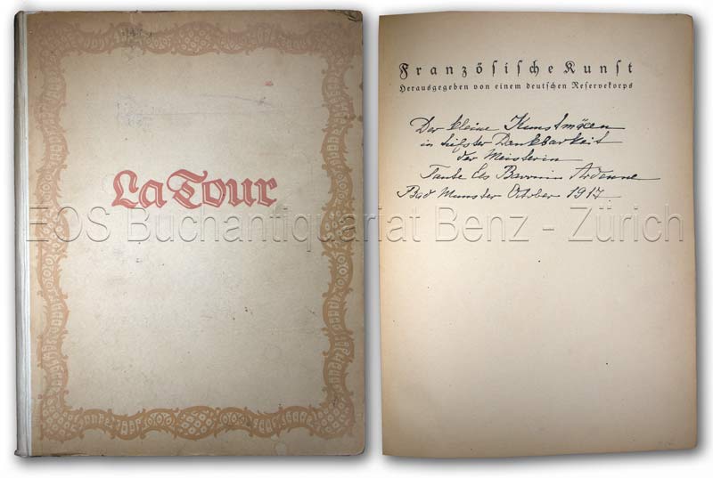 Aus der Reihe “Französische Kunst”, hrsg. von einem deutschen Reservekorps. – Mit eigenhd. Widmung auf Vortitel “Der kleinen Kunstmäzenin in liebster Dankbarkeit. Tante Els Baronin Ardenne. Bad Münster October 1917”. Das Schicksal von Elisabeth Baronin von Ardenne (Zerben 1853-1952 Lindau) diente Theodor Fontane als Anregung für seinen Roman Effi Briest (1895). Die Sammlung La Tour wurde von der deutschen Armee aus dem bombardierten St. Quentin in Sicherheit gebracht. Der Herausgeber widmete das Buch Wilhelm II., König von Württemberg. – Buchdeckel gebräunt und etwas fleckig. (Sprache: Deutsch / German)