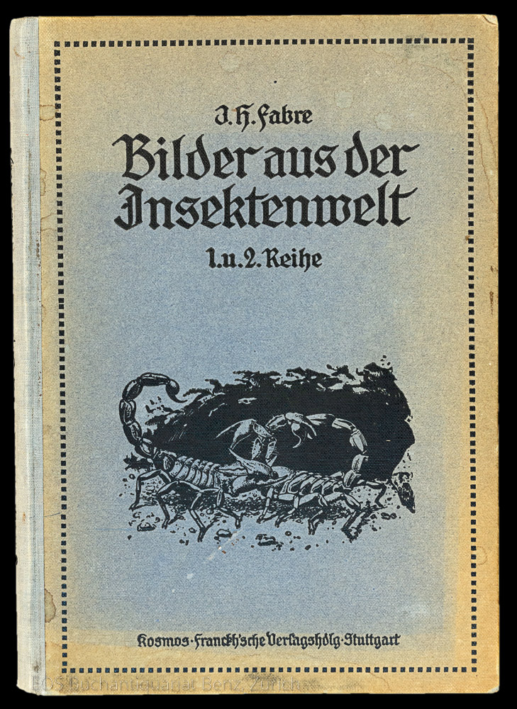 Fabre, Jean-Henri: Bilder aus der Insektenwelt. Erste (–vierte) Reihe. Stuttgart, Kosmos, Gesellschaft der Naturfreunde, 1914. Zweite Auflage. 2 Bände. Gr.-8°. 126 S.; 2 Bl., 103 S.; 104 S.; 103 S. Mit einem Porträtfrontispiz und zahlr. Abb. im Text. Halbleinenband der Zeit.
