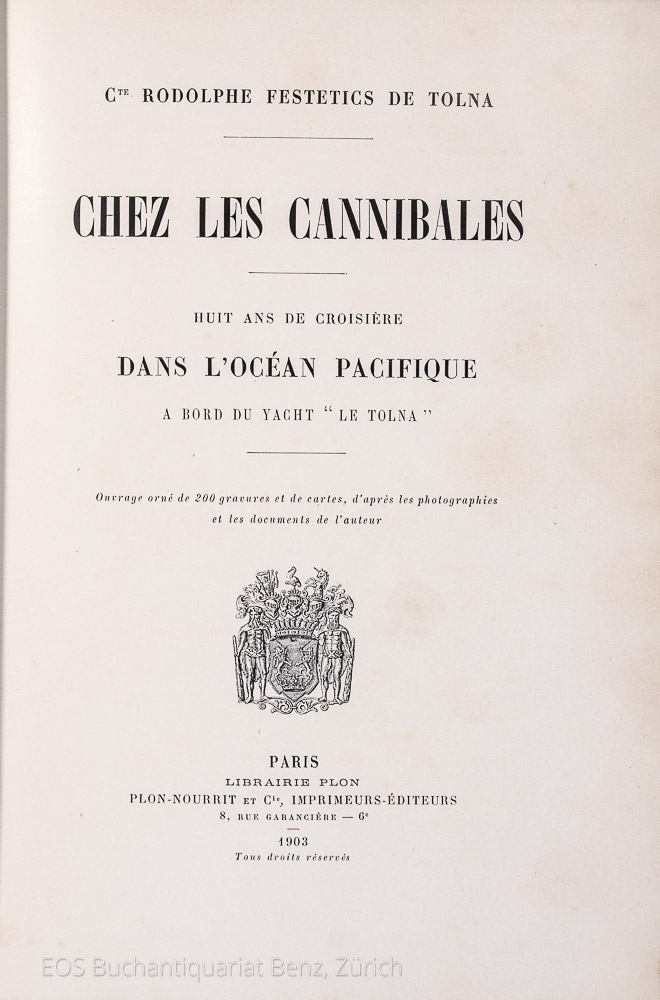 Festetics von Tolna, Rudolf und Mandat-Grancey, Edmond: Chez les cannibales. Huit ans de croisière dans l’Océan Pacifique à bord du yacht «Le Tolna». Paris, Plon-Nourrit et Cie, 1903. 4°. IV, 407 S. Mit zahlr. Textillustrationen und 1 gef. Karte. Halbleinenband der Zeit.
