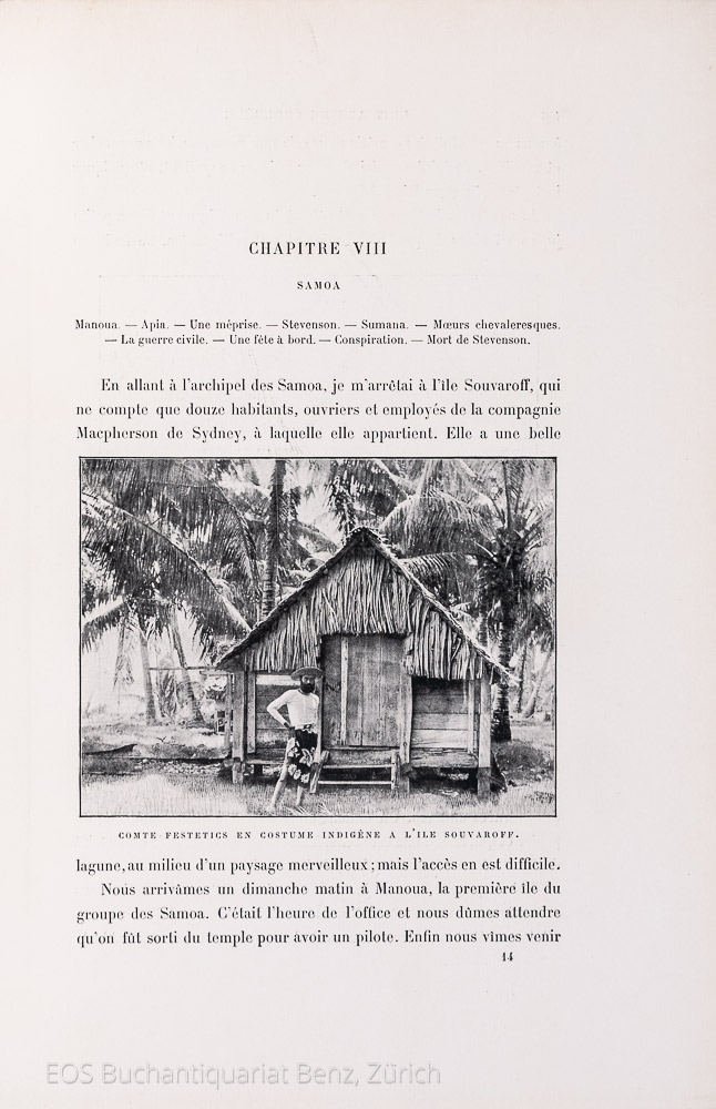 O’Reilly / Reitman 1383. – «Venant de San Francisco par les îles Hawaii, le Tolna arriva à Tahiti le 11 janvier 1894 et y séjourna jusqu’au 15 avril, p. 65–83. La famille royale; promenades dans lîle; réceptions; visite à Mooréa; souvenirs des frères Rorique. Six photographies documentaires, dont une de la princesse Manihinihi et d’autres de la famille Brander. Les Salmon, ici senomment Salomon». (Sprache: Französisch / Français / French)