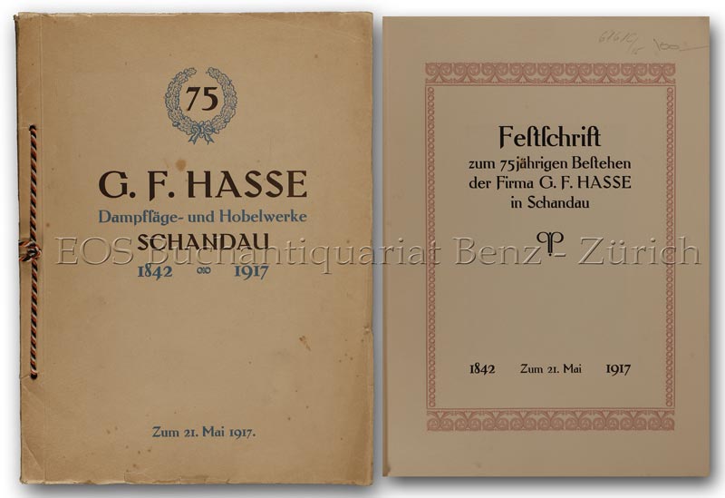 Festschrift zum 75jährigen Bestehen der Firma G. F. Hasse in Schandau. 21. Mai 1842-1917. Dresden, Römmler & Jonas, 1917. 4°. 27 Bl. Mit zahlr. Abb. im Text. Orig.-Broschur mit Kordelbindung.