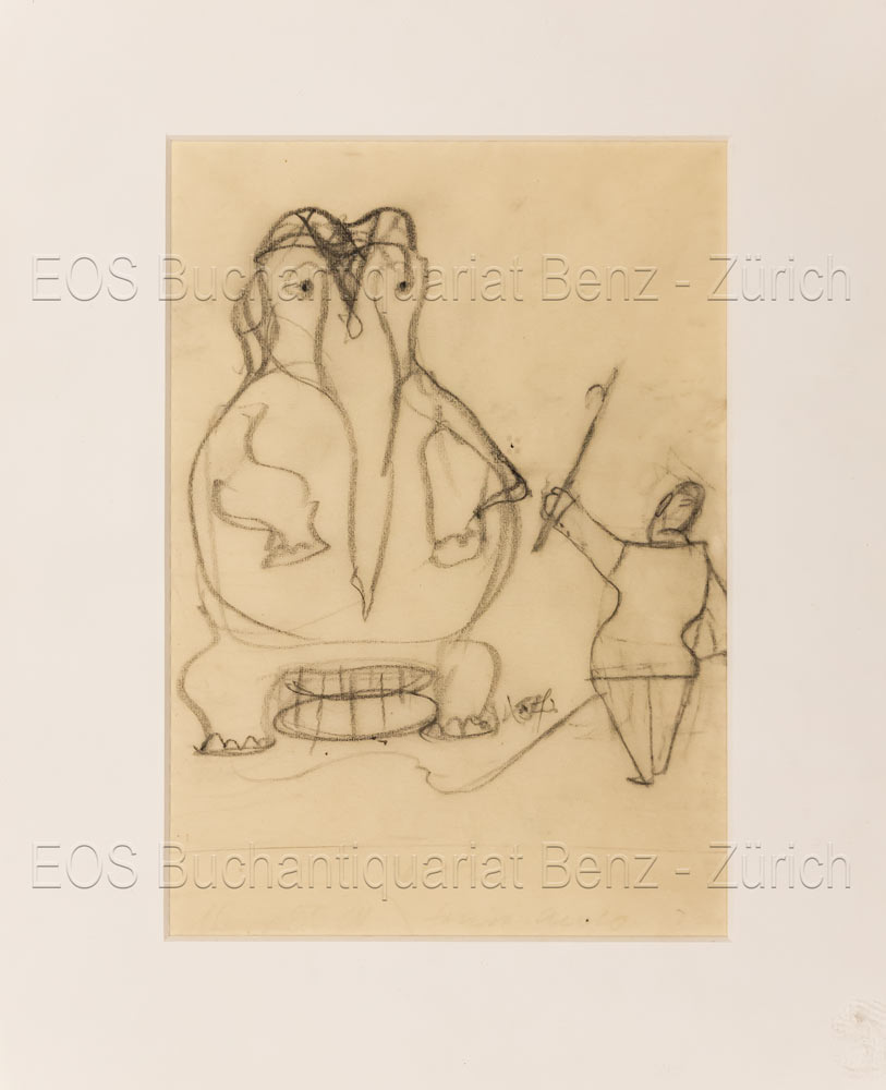 Fischer, Hans (1909–1958): Elefantendressur. Bleistiftzeichnung auf Pergamin. 1951. Bildausschnitt: 20 x 14 cm. Bildausschnitt: 20 x 14 cm.