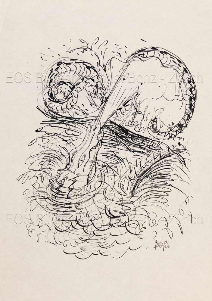 Fischer, Hans (1909–1958): Schlange, Elefant und Krokodil. um 1945. Blattgrösse: 21 x 14,8 cm. Tuschzeichnung von Hans Fischer (fis).