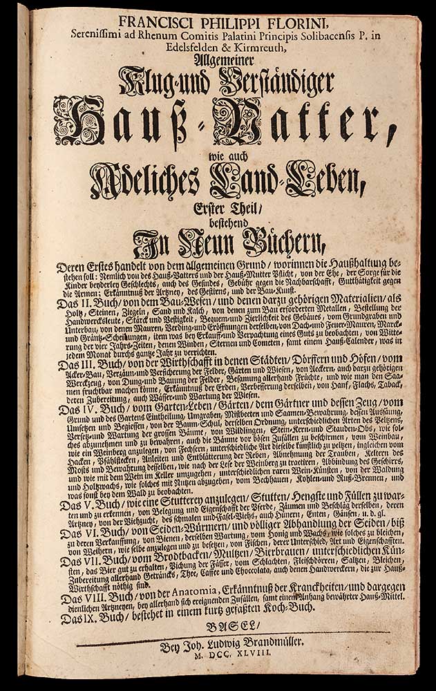 Florin, Franz Philipp: Allgemeiner klug-verständiger Hauss-Vatter wie auch adeliches Land-Leben. Erster Theil – bestehend in neun Büchern. Basel, Joh. Ludwig Brandmüller, 1748. 1 (von 2) Teil in 1 Band. Gr.-4°. (1) Bl., 862 (recte 860) S. Mit gest. Frontispiz. Späterer Halblederband.