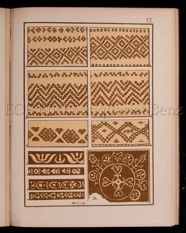 Forrer, R(obert): Römische und Byzantinische Seiden-Textilien aus dem Gräberfelde von Achmim-Panopolis. Strassburg, (gedr. bei Emil Birkhäuser, Basel, R. Fretz, Zürich, Dr. Mertens & Cie., Berlin, J. Kraemer, Kehl), 1891. Gr.-4°. 28 S. Text und 17 Tafeln (6 in Farbdruck, 3 in Lichtdruck), 6 Abb. im Text. Orig.-Ln.