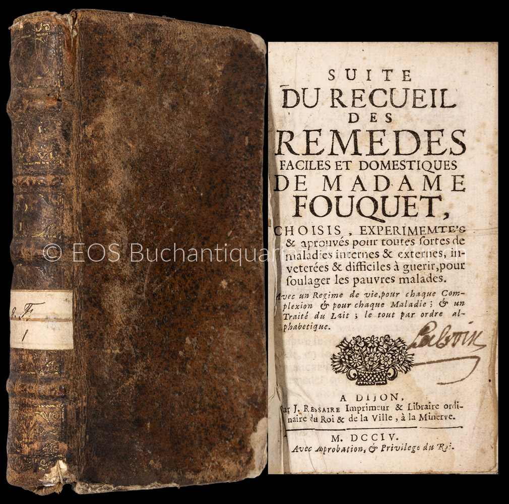 Fouquet, Marie: Recueil et suite des remèdes faciles et domestiques. choisis, expérimentez & aprouves pour toutes sortes de maladies internes & externes… Dijon, J. Resaire, 1704. Kl.-8°. (12), 392, (16) S. Lederband der Zeit.