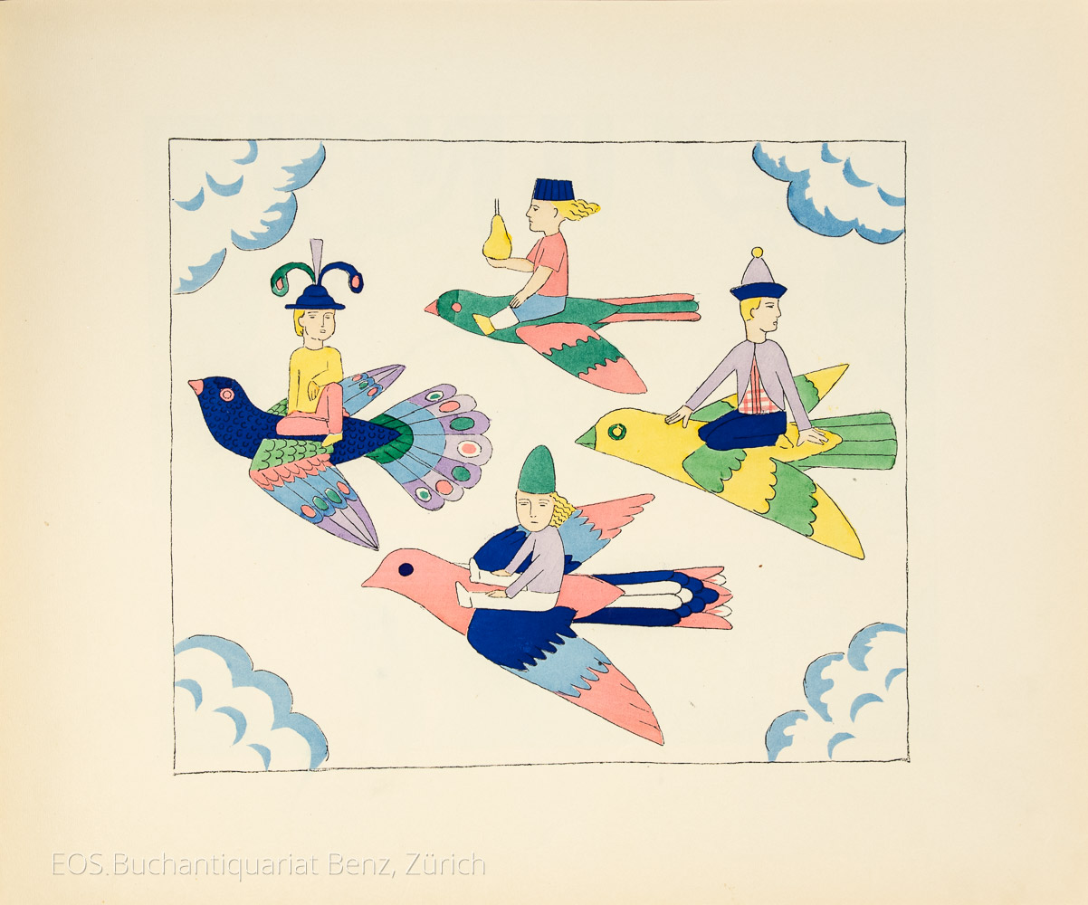 Doderer I, 413. – Ries 530. – Schug 516. – Bilderwelt 516. – Stuck Villa II, 185. – Pressler S. 208. – Vgl. Cotsen 3548 (für Ausgabe um 1908). – Zweite Auflage des zweiten Buches in dieser Reihe. – Freyhold (1878–1944) unternahm nach seinem Studium an der Karlsruher Akadamie Reisen nach London, Fiesole und Paris. Geprägt vom franz. Impressionismus wirkte er erstmals bei der Illustration von Dehmels Sammelband «Buntscheck» (Köln 1904) mit. Darauf publizierte er selbständig seine Bilderbücher, womit er sofort grosse Aufmerksamkeit erlangte. Seine Kinderbücher sind vom Einband über die Vorsätze bis zum Inhalt als Einheit, detailreich mit zarten Pastellfarben durchgestaltet. «Hier macht sich der Einfluss der Kunsterziehungsbewegung auf Freyhold geltend. In einer Vorliebe für pflanzenhafte Motive und für die Ornamentik finden sich Elemente des Jugendstils» (Doderer). – Durchgehend fingerfleckig, Gebrauchsspuren, Einband berieben und fleckig. – Gutes Exemplar. (Sprache: Deutsch / German)