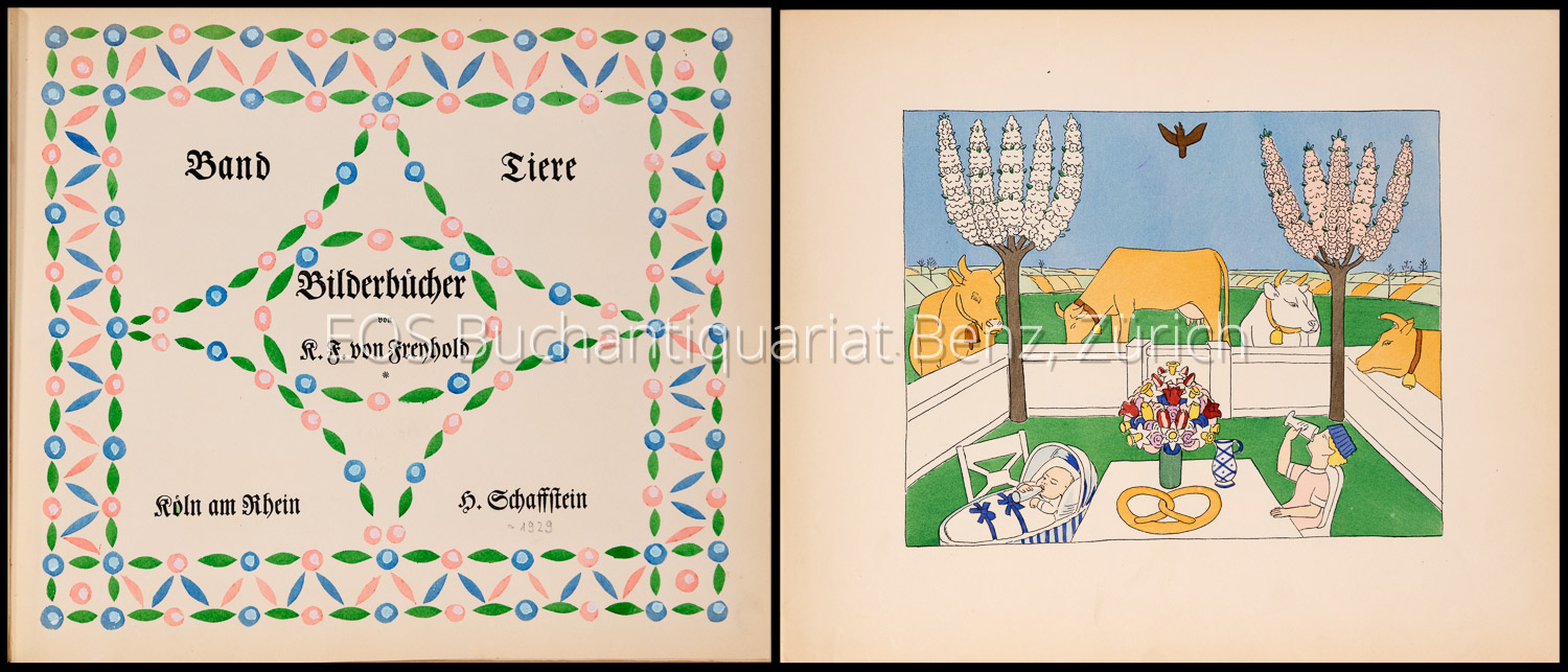 Freyhold, Konrad Ferdinand Edmund von: Tiere. Bilderbuch von K. F. von Freyhold. Köln, Schaffstein, (1929). Quer-4°. 12 ganzs. Lithographien in Pochoirkolorit von Freyhold. Illustr. Orig.-Halbleinenband mit erneuertem Rücken.