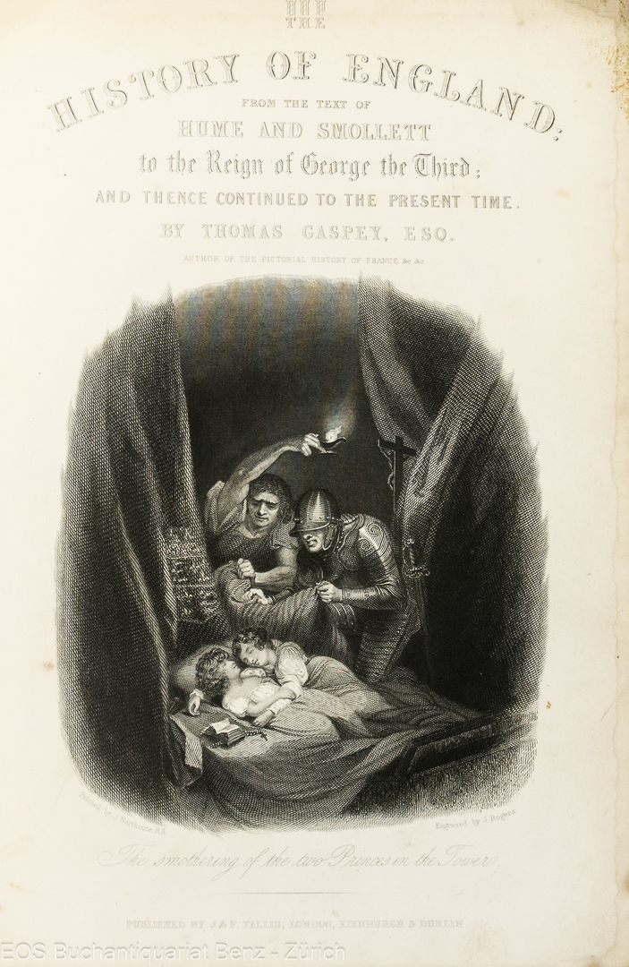 Gaspey, Thomas: The History of England: from the Text of Hume and Smollett to the Riegn of George the Third; and thence continued to include the restoration of the Empire in France. The Great Exhibitione of the Industry of all Nations and the Death of the Duke of Wellington. London, Printing and Publishing Company, um 1852. 8 Bände. Mit zahlr. Illustrationen.