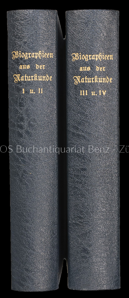 Grube, August Wilhelm: Biographieen aus der Naturkunde, in ästhetischer Form und religiösem Sinne. Stuttgart, Steinkopf, 1869. Sechste verbesserte Auflage, 4 Teile in 2 Bänden. 364 S., 268 S.; 267 S., 331 S. Mit 1 lithogr. Frontisp., 4 lithogr. Tafeln und 4 Textillustr. Moderne Kunstlederbände.