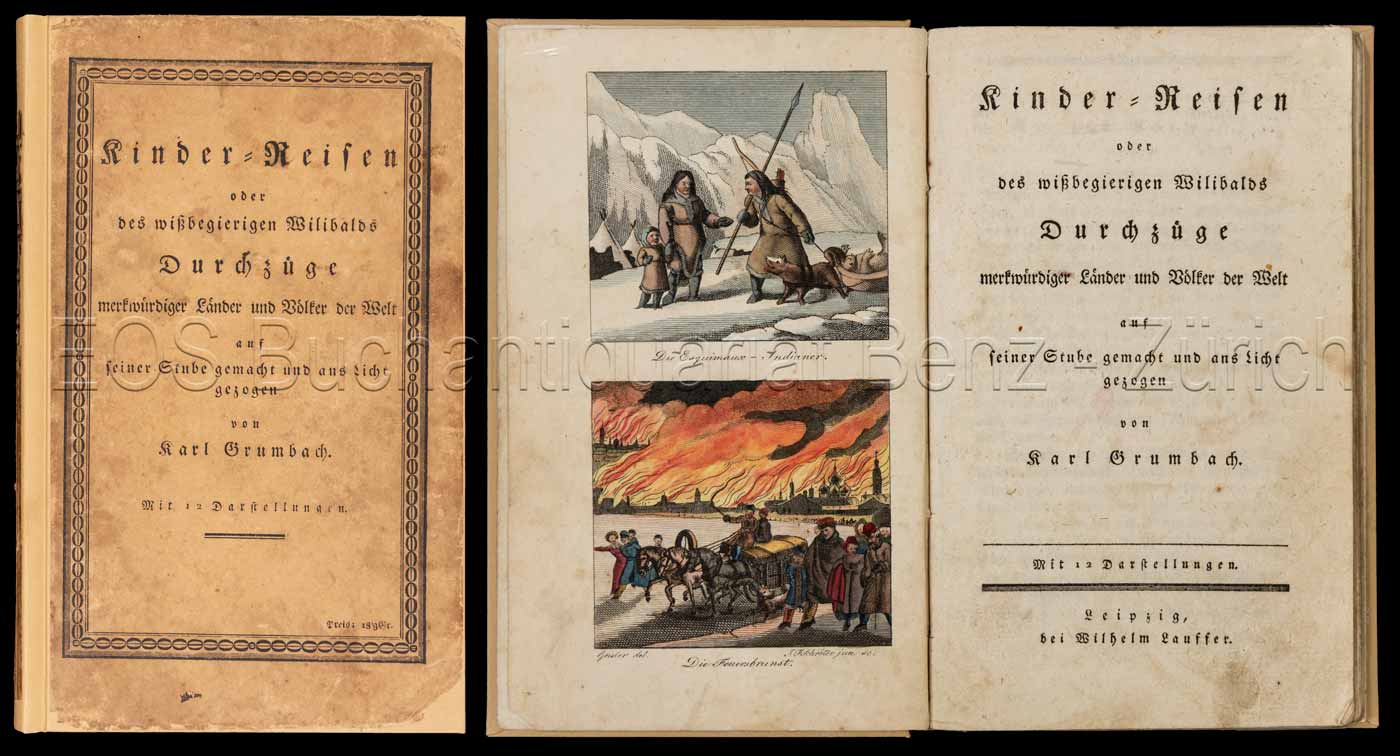 Grumbach, Karl:  Kinder-Reisen oder des wissbegierigen Wilibalds Durchzüge merkwürdiger Länder und Völker der Welt auf seiner Stube gemacht und ans Licht gezogen. Leipzig, Wilhelm Lauffer, 1827. 8°. (4), 99, (1) S. Mit 6 kol. Kupferstich-Tafeln (12 Illustr.). Orig.-Pappband.