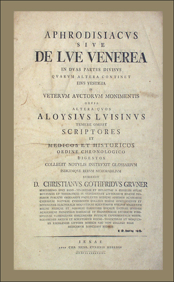 Gruner, Christian Gottfried:  Aphrodisiacus, sive de lue venerea. In duas partes divisus, quarum altera continet ejus vestigia in veterum auctorum monimentis obvia, altera quos Aloysius Luisinus temere omisit scriptores et medicos et historicos ordine chronologico … Jena, Chr. Henr. Cunonis Heredes, 1789. Tomus Tertius. Folio. 4 n.n. Bl., VI S., 1 n.n. Bl., 166 S., 8 n.n. Bl. Glossar und Index. Lädierter Halblederband der Zeit.