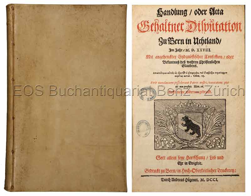Handlung oder Acta gehaltner Disputation zu Bern in Uchtland im Jahr M.D.XXVIII. Mit angehenckter Eydgnössischer Confession oder Bekantnuss dess wahren christenlichen Glaubens. Gedruckt zu Bern, in Hoch-Oberkeitlicher Truckerey, durch Andreas Huegenet, 1701. Auffs newe widerum gedruckt. 2°. (8) Bl., 489 (recte 487) S., (5) Bl., 151, (1) S. Mit Holzschnitt-Titelvignette. Pergamentband der Zeit.