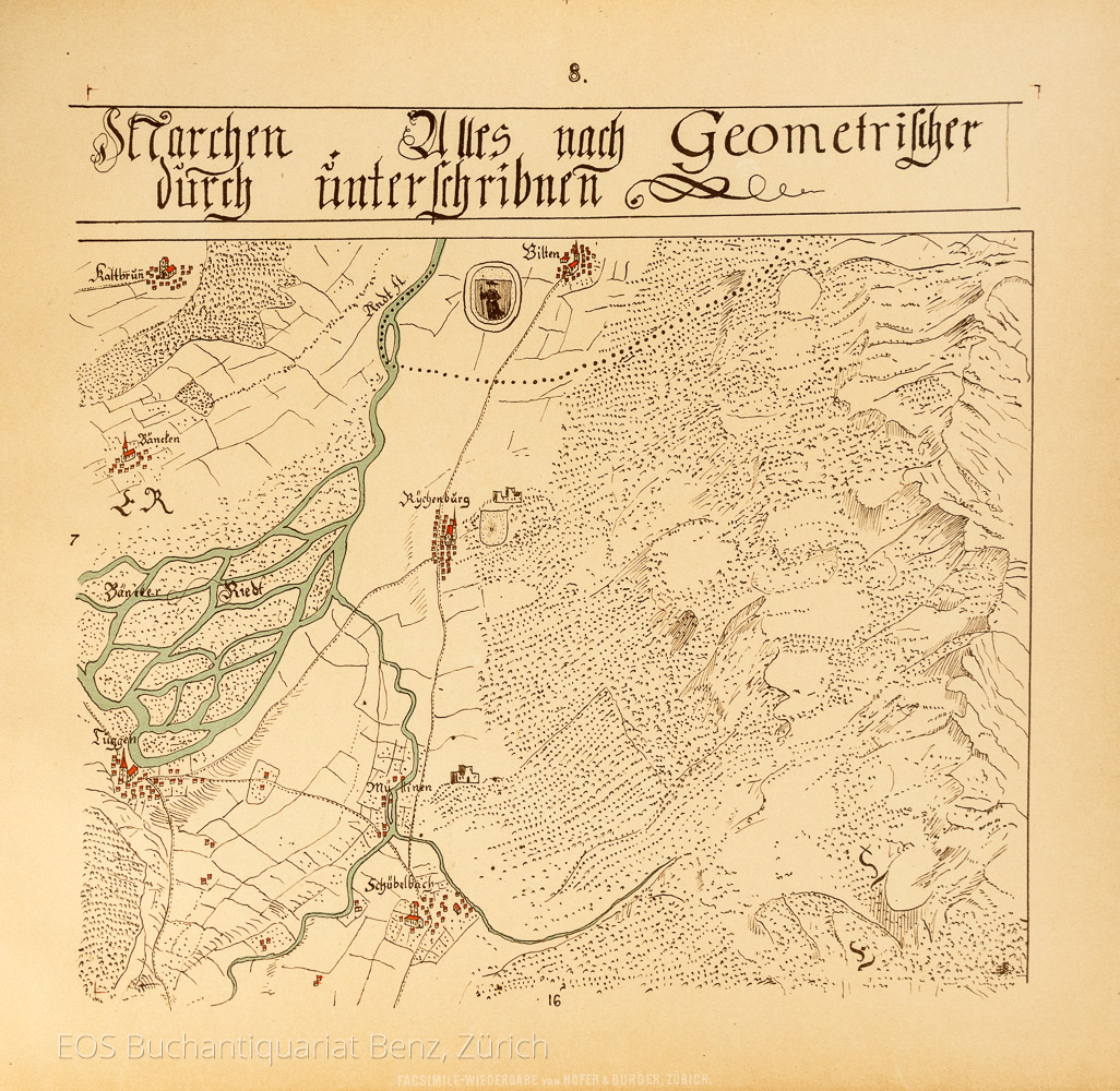 Hans Konrad Gyger’s Züricher-Cantons-Carte 1667. Zürich, Hofer & Burger, 1891. Quer.-folio. (7) Bl. Mit Frontisp., Übersichtskarte und 56 Karten (chromolithogr. Reproduktionen). Illustr. Orig.-Halbleinenband.