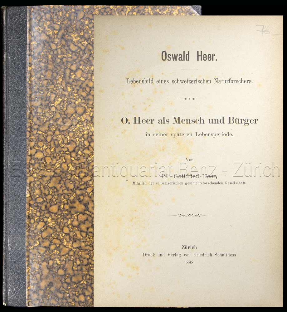 Heer, Gottfried: Oswald Heer. Lebensbild eines schweizerischen Naturforschers. O. Heer als Mensch und Bürger in seiner späteren Lebensperiode. Zürich, Friedrich Schulthess, 1888. 8°. 125 S. Halbleinenband der Zeit.