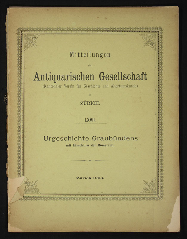 Aus der Reihe: “Mitteilungen der Antiquarischen Gesellschaft in Zürich.”, Band LXVII. Broschurumschlag mit Einrissen. Rücken mit Fehlstellen. Bindung gelockert. Papier durchgehend gebräunt.
