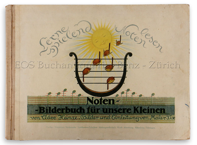 Heinze, Cläre:  Lerne spielend Noten lesen. Noten-Bilderbuch für unsere Kleinen. Altenburg, Spielkartenfabrik, (1929). Quer-4°. 35 S. Mit farb. Illustr. von Pix (d.i. Otto Pech). Farbig illustrierter Orig.-Halbleinenband.